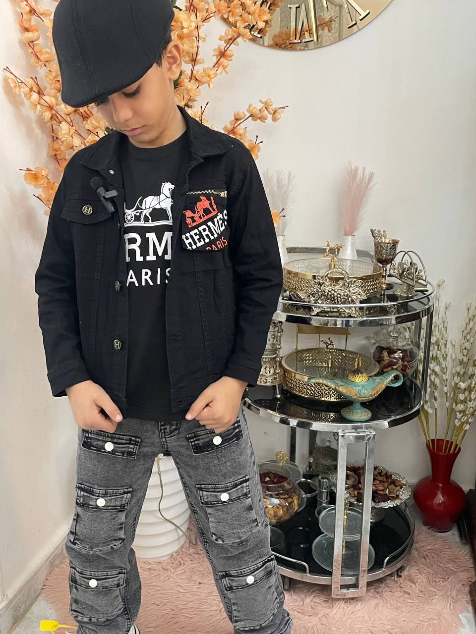 .يشمل تیشيرت 100% قطن مع شعار مطرّز وسترة بومبر خفيفة مع سروال جين عصري . تصميم مريح وعصري يجعل طفلك متألقًا في العيد ,Hermess طقم أطفال أنيق من ماركة